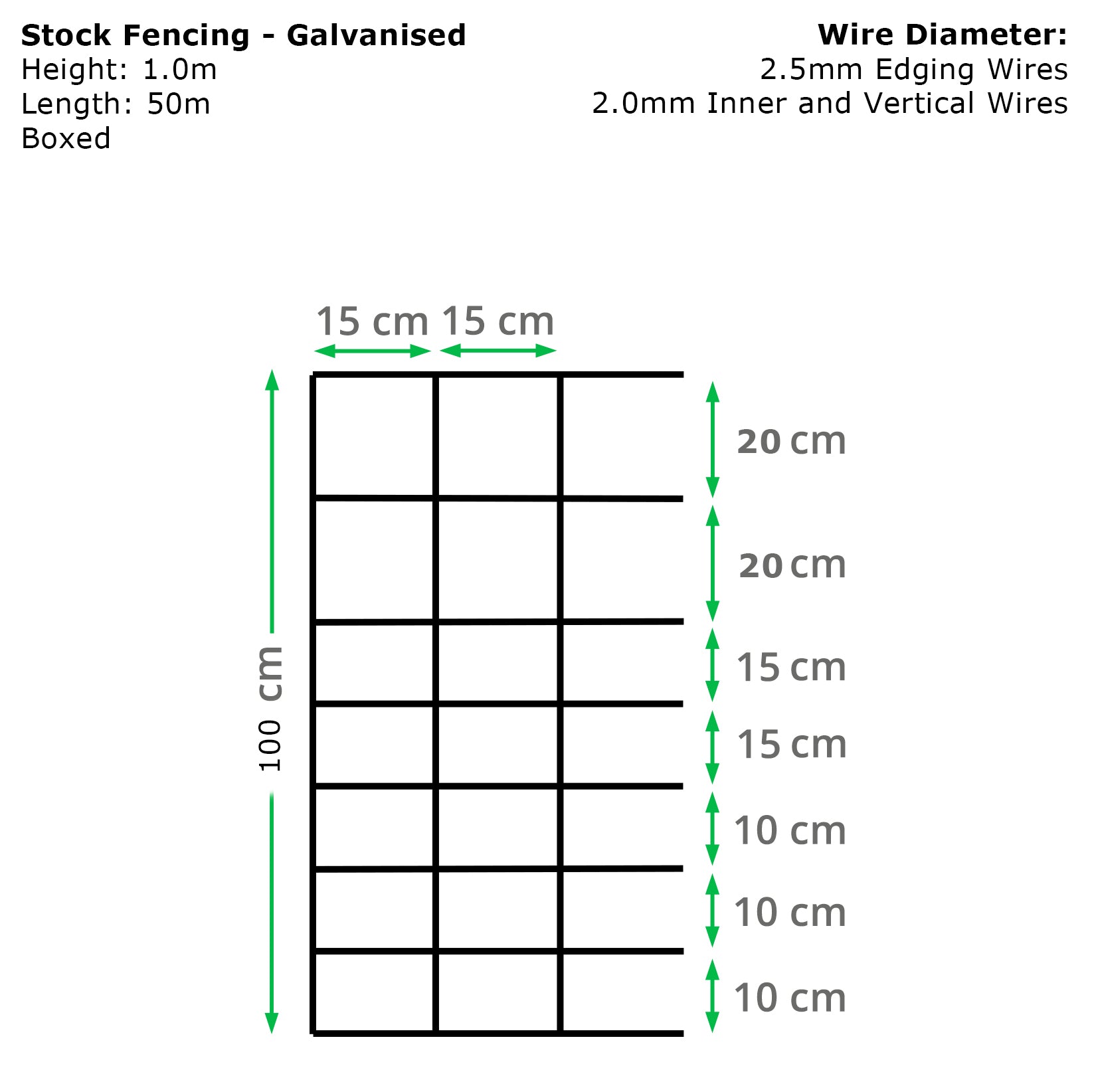 Heavy-duty galvanised stock fencing wire designed for long-lasting outdoor use. Each 50-metre roll features 2.5mm top and bottom edge wires and 2.0mm vertical and inner wires for strength and durability. Available in 0.8m, 1.0m, or 1.2m heights, this fencing is ideal for livestock, garden boundaries, and farm perimeter protection.